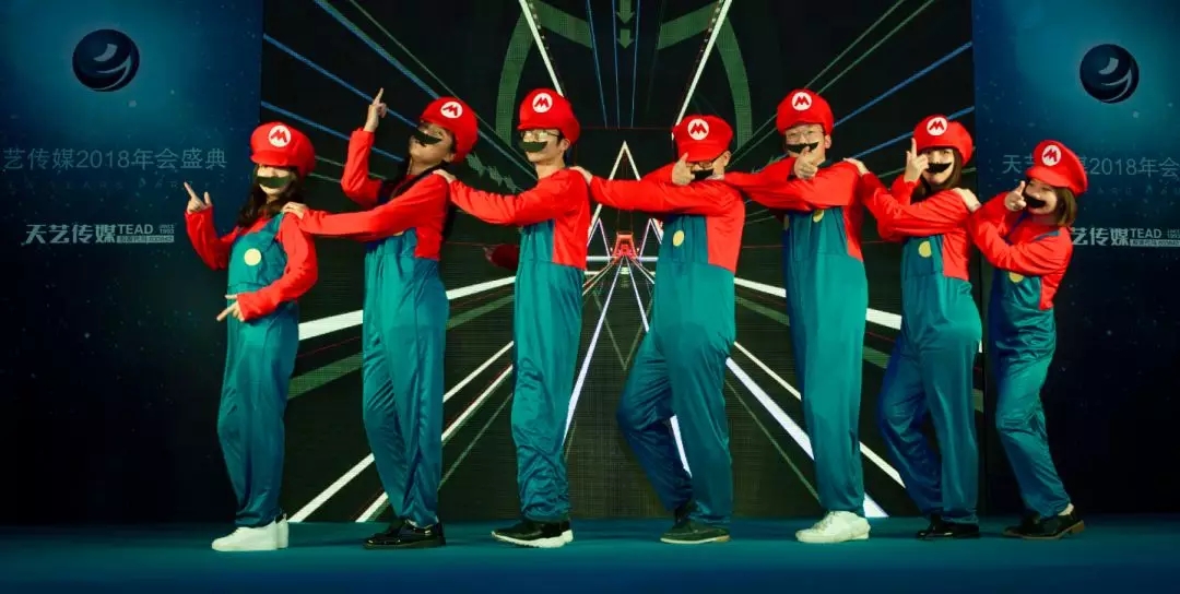 舞臺(tái)燈光驟然熄滅,再次點(diǎn)亮?xí)r,一群紅帽紅衣戴著大胡子的馬里奧“叔叔”出現(xiàn)啦!